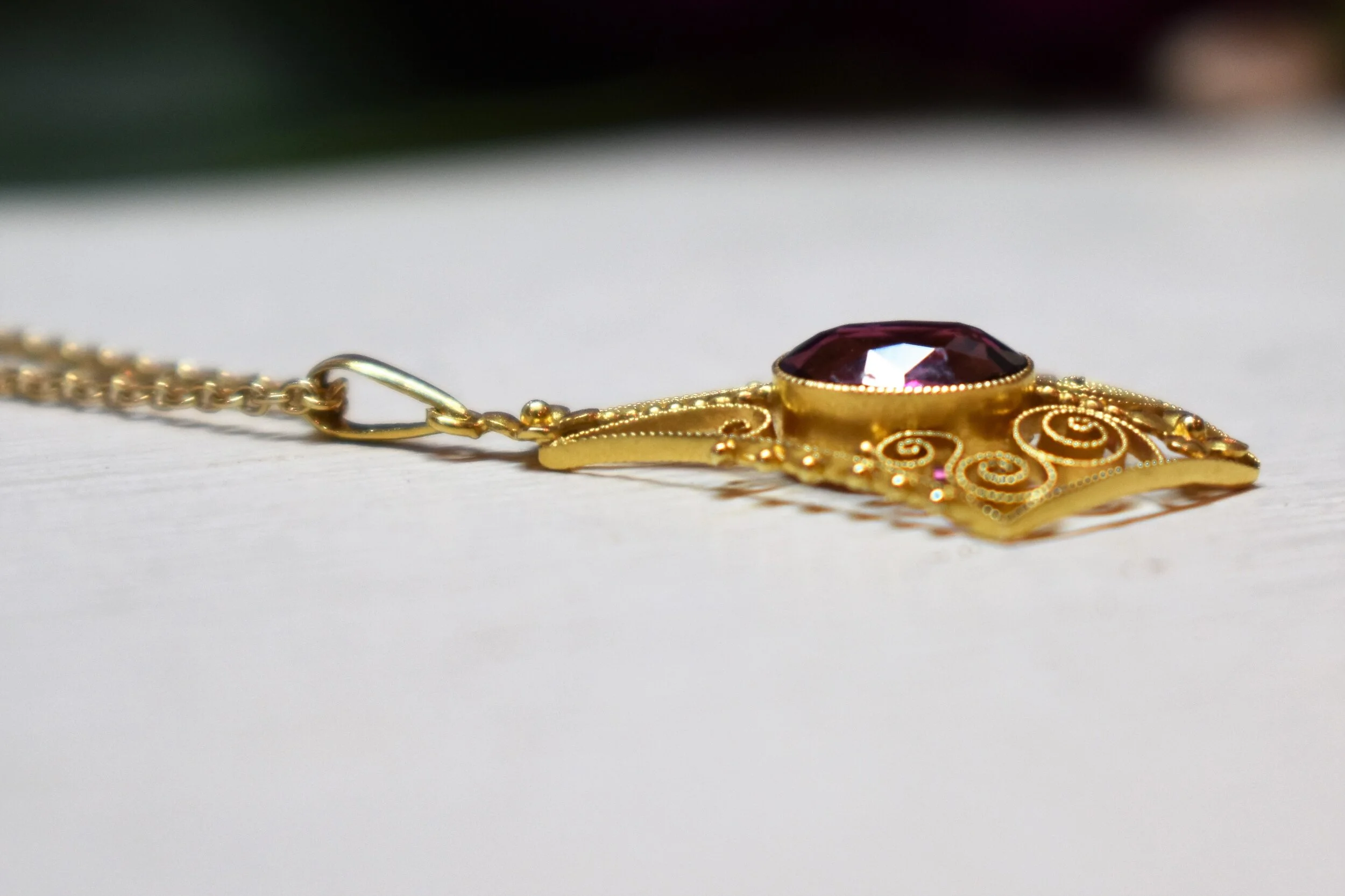 Beautiful antique lavalier pendant featuring a delicate filigree design surrounding a natural pink tourmaline. The tourmaline measures 8x6 mm, approximately 1.30 carat. The pendant hangs on a 16” cable chain.